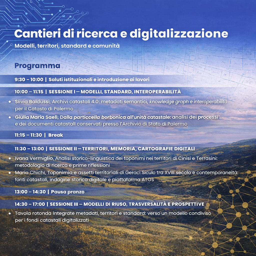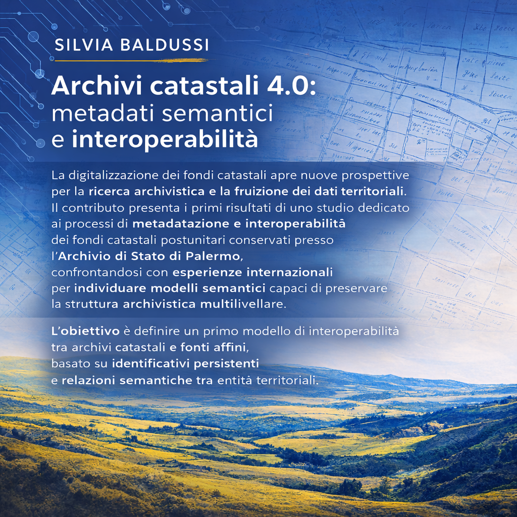 1. Silvia Baldussi, borsista DicoLab | “Archivi catastali 4.0: metadati semantici, knowledge graph e interoperabilità per il Catasto di Palermo” | Discussant: Prof. Diego Mantoan, Dott.ssa Serena Falletta
