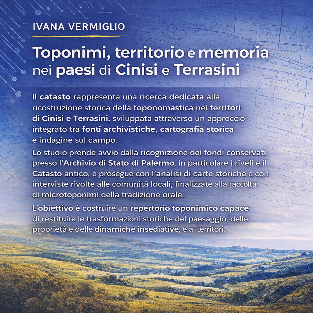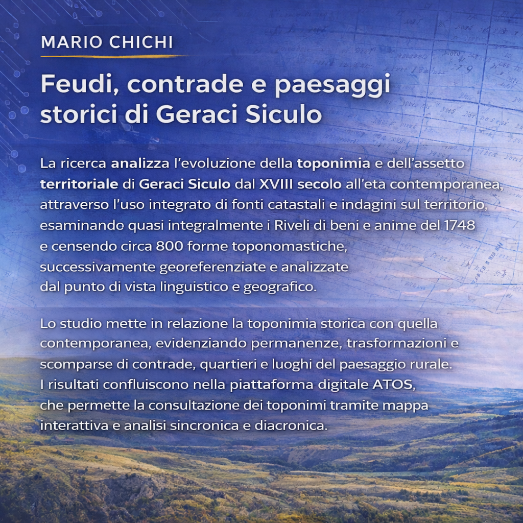 4. Mario Chichi, borsista DicoLab | “Toponimia e assetti territoriali di Geraci Siculo tra XVIII secolo e contemporaneità: fonti catastali, indagine sincronica e piattaforma ATOS” | Discussant: Prof. Vincenzo Pinello, Dott.ssa Simona Fazio