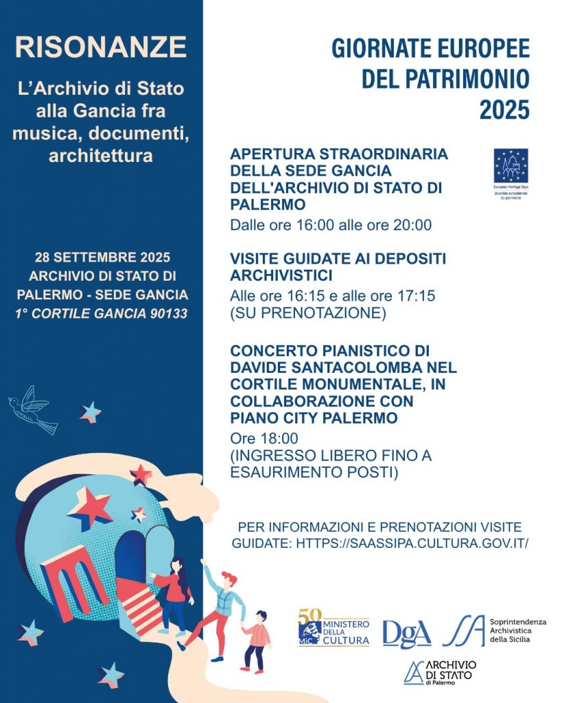 In occasione dell’edizione 2025, l’Istituto propone l’iniziativa “Risonanze. L’Archivio di Stato alla Gancia fra musica, documenti e architettura”, realizzata in collaborazione con il festival Piano City Palermo 2025. L’evento si terrà domenica 28 settembre 2025 presso la sede Gancia dell’Archivio di Stato, e prevede: